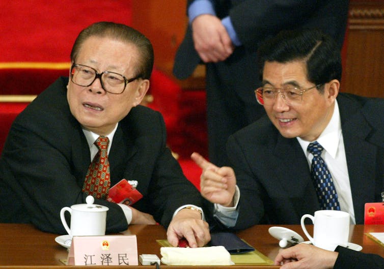 Former presidents Jiang Zemin (left) and Hu Jintao cautiously achieved balance in their politburos.