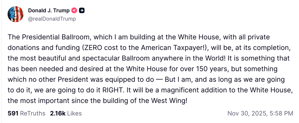 "The Presidential Ballroom, which I am building at the White House, with all private donations and funding (ZERO cost to the American Taxpayer!), will be, at its completion, the most beautiful and spectacular Ballroom anywhere in the World!" Trump boasted. "It is something that has been needed and desired at the White House for over 150 years, but something which no other President was equipped to do — But I am, and as long as we are going to do it, we are going to do it RIGHT. It will be a magnificent addition to the White House, the most important since the building of the West Wing!