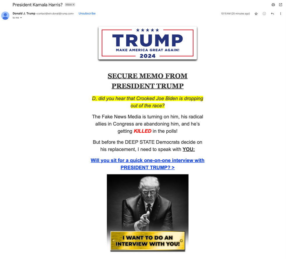 In an email to his supporters, Trump asked, "Did you hear that Crooked Joe Biden is dropping out of the race?"