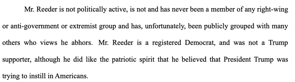 "Mr. Reeder is not politically active, is not and has never been a member of any right-wing or anti-government or extremist group and has, unfortunately, been publicly grouped with many others who views he abhors. Mr. Reeder is a registered Democrat, and was not a Trump supporter, although he did like the patriotic spirit that he believed that President Trump was trying to instill in Americans," defense attorney Robert C. Bonsib wrote in a sentencing memo.
