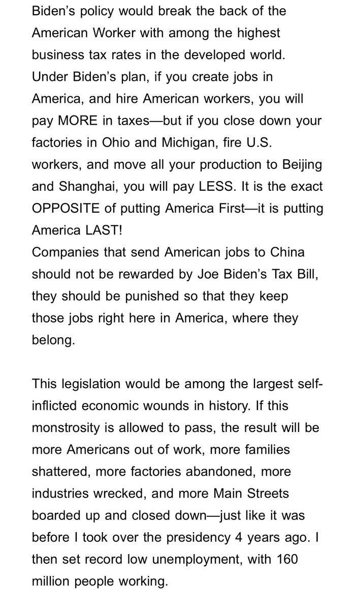 "Joe Biden's radical plan to implement the largest tax hike in American history is a massive giveaway to China, and many other countries, that will send thousands of factories, millions of jobs, and trillions of dollars to these competitive Nations," the ex-president said. "The Biden plan will crush American workers and decimate U.S. manufacturing, while giving special tax privileges to outsourcers, foreign and giant multinational companies."