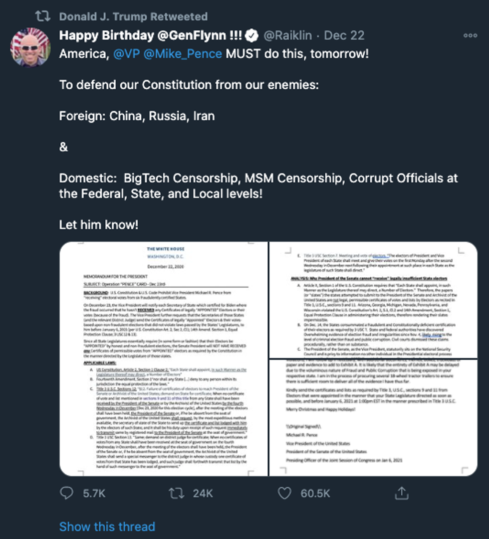 Trump retweeted a demand for Pence to "act" on the election, but aides told CNN that Trump's conversation was "entirely unrelated" to the tweet.