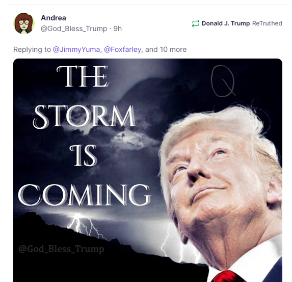 Among other things, the former president promoted a meme that featured a photo of him with a "Q" written clearly above his head along with the caption, "The storm is coming."