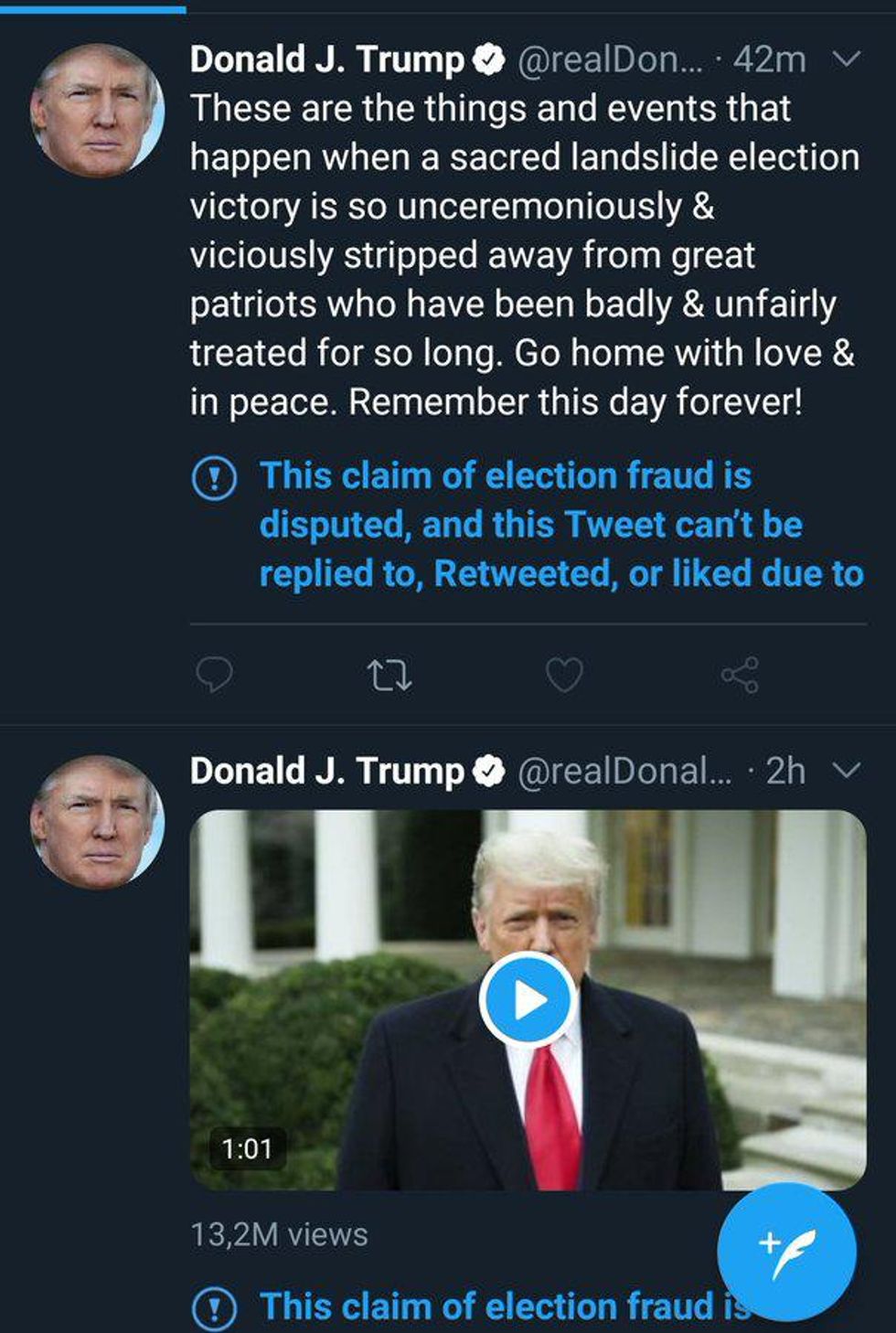 Trump has tweeted calls for "peace" at the Capitol, but then put out a video egging on protesters calling the election stolen from the supporters. The video and the tweet that followed it was removed by Twitter.