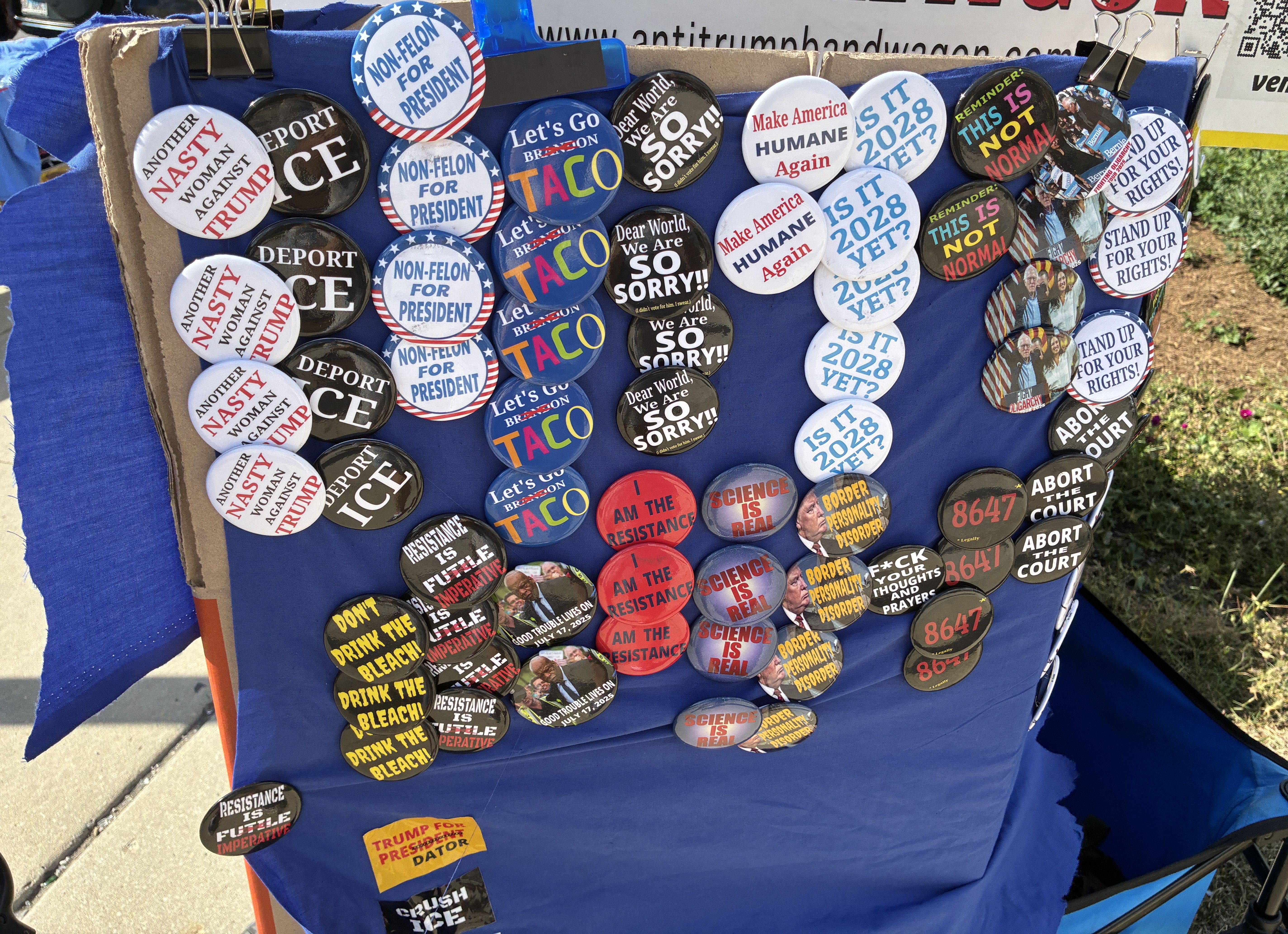 Buttons on Stan Sinberg's wagon dubbed “The Roving Anti-Trump ‘Save Democracy Tour!’ Band-Wagon.” (Photo by Alexandria Jacobson/Raw Story)